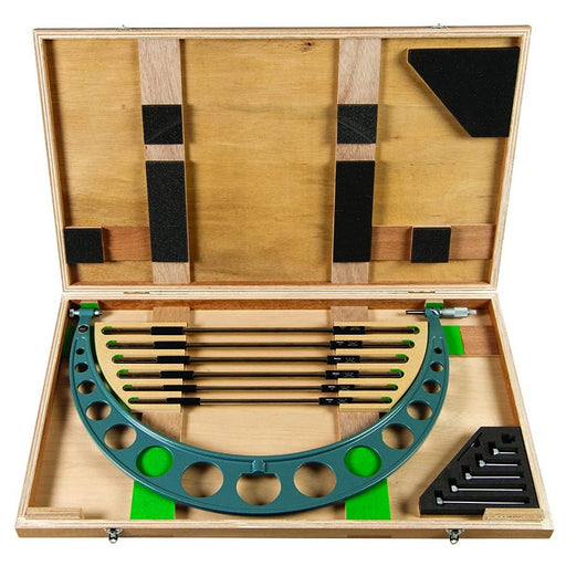 The Mitutoyo 103-142-10 Outside Mechanical Micrometer features a hammertone, green, baked-enamel finished frame and Carbide tipped measuring faces....